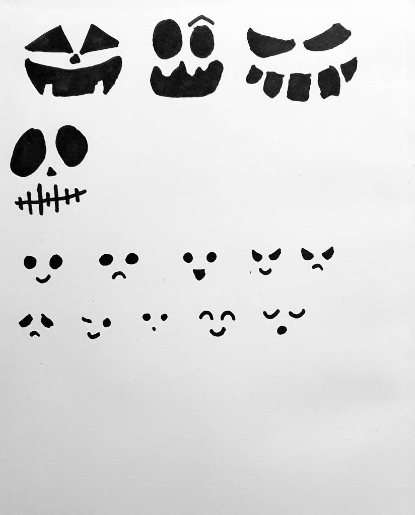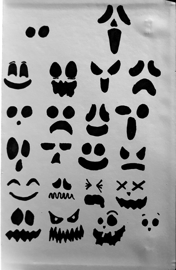 After making about 20 or so ghosts, I ran into a problem where I was beginning to develop same-face syndrome and just wanted the ghosts to be simple forms with 2 circular eyes. Since I wanted my ghosts to be more dynamic and have a range of expressions, I took it upon myself to just draw random basic shapes to get a sense of what kind of faces I could make. Due to this point in the project taking place around the time of Halloween, I found myself drawing inspiration from a plethora of decorations that were beginning to pop up on store shelves. I took elements of jack o’ lantern designs as well as more complex scary shapes to give a further range to my already explored faces. This in turn would create a sense of evolution amongst the ghosts themselves, where as the protagonist would grow darker so would the expressions present on the ghosts.