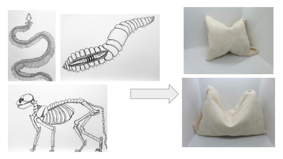I began to experiment with fabric and texture as a basis for whether I wanted there to be puppets of the test subjects or fabric to create weirdly shaped body parts to dye and put into the jars that would be displayed. These would be what would’ve comprised my repetitive making as the texture within was made with a combination of paper springs (2 long strips of paper coiled in such a way to create springs) and cardboard spirals (recycled cardboard tightly wound up and glued to create cylindrical forms). During this experimentation, it was my first time sewing in years and even dusted off an old sewing machine to see how it feels to make these objects over and over again. However, I remembered really quickly how taxing this process is on my dexterity and knew after 2 pouches that I would not be able to keep going with this process. With that in mind, I decided there and then that this concept would go no further so the story was added to the bank for future use and the sewing machine was put back in a drawer to collect dust again. Thankfully at this point, I had already started writing out my notes and experimenting with making my next concept so I wasn’t at a complete loss.