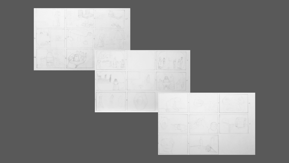 Once I knew that animation was the chosen medium I was going to use to tell my story, I set about trying to figure out what I wanted each scene to showcase. I didn’t have much knowledge on storyboarding going into this project, all I really knew was that you drew rough sketches into boxes to add to and develop. After some brief research, I found that depending on the chosen medium the amount of detail can vary with how the storyboards are presented. For example, in the case of animation, the storyboards tend to lack detail to have more focus on showcasing the movement of elements between frames, whereas storyboards in mediums like Film and Video Games prefer their storyboards to be more refined and detailed so that it is a lot easier to compare them to the shot lists and perceive how the elements come together.